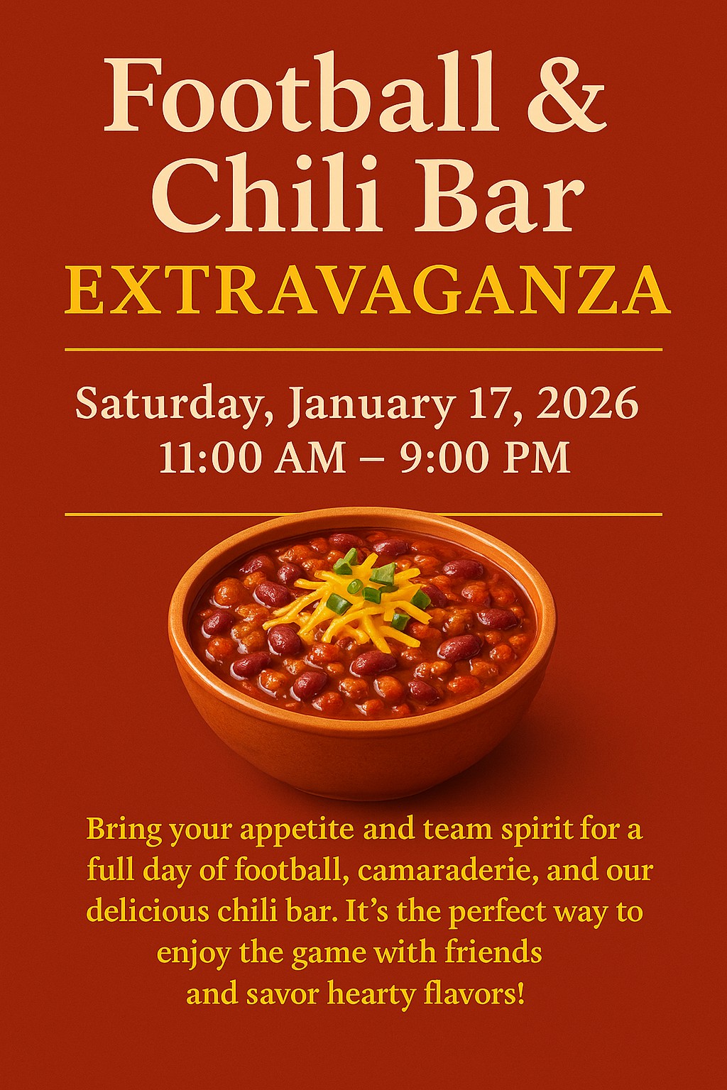 Chili Extravaganza January 9, 2026 at 9:01 pm Comments are closed Calendar Add to Calendar Add to Timely Calendar Add to Google Add to Outlook Add to Apple Calendar Add to other calendar Export to XML When: January 17, 2026 @ 11:00 am – 9:00 pm 2026-01-17T11:00:00-06:00 2026-01-17T21:00:00-06:00 Contact: Melinda De Bartolo 712-366-0525 Email Bring your appetite and team spirit for a full day of football, camaraderie, and our delicious chili bar. It’s the perfect way to enjoy the game with friends and savor hearty flavors!