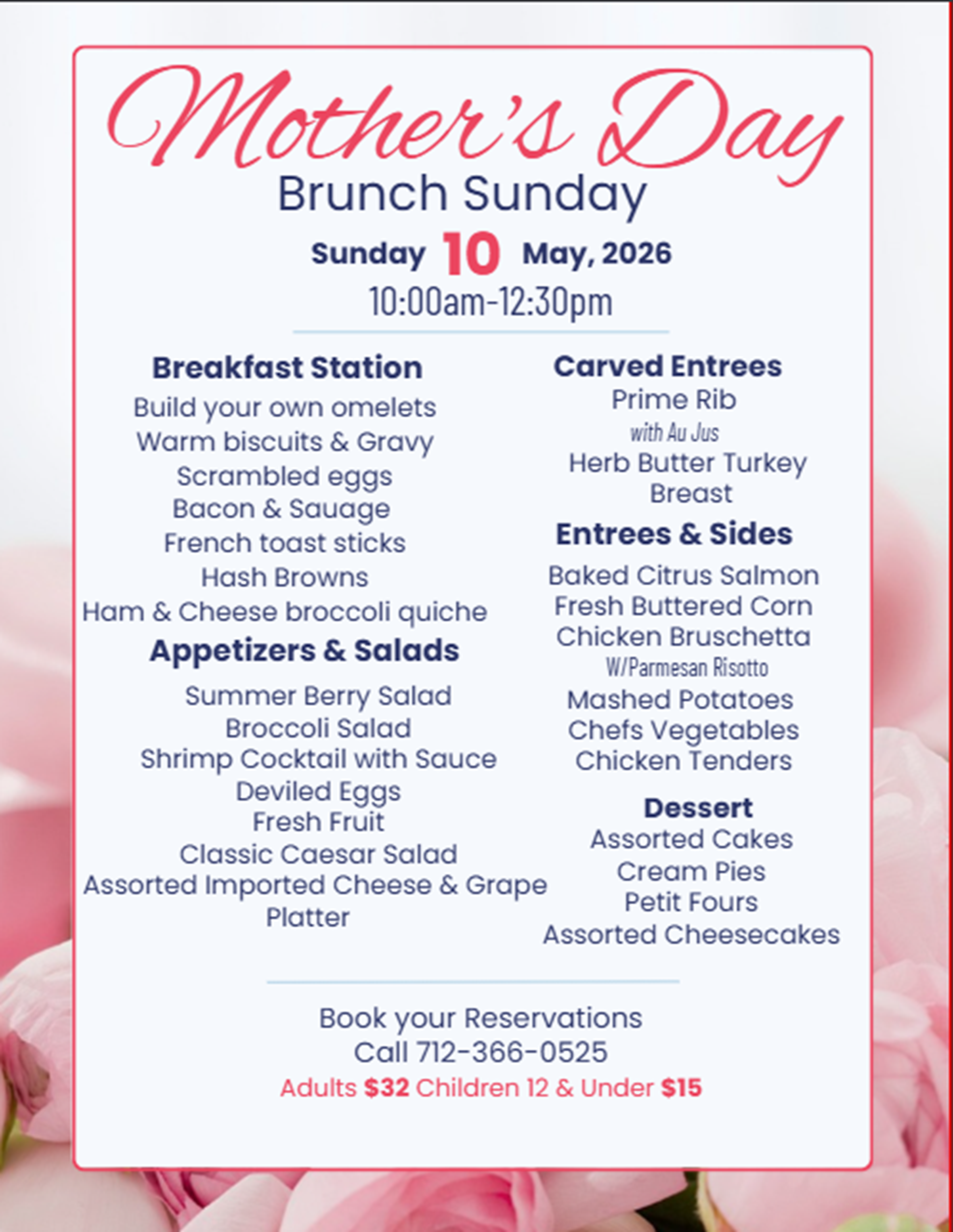 Mother’s Day Brunch May 4, 2020 at 11:20 am Comments are closed Calendar Add to Calendar Add to Timely Calendar Add to Google Add to Outlook Add to Apple Calendar Add to other calendar Export to XML When: May 10, 2026 @ 10:00 am – 3:00 pm 2026-05-10T10:00:00-05:00 2026-05-10T15:00:00-05:00 Contact: Jasmine Hernandez 712-828-4501 Email Club House Mother’s Day Brunch – Menu Call now to make your reservation – limited seating. 2 seating times – 10 & 12:30 712-366-0525 – Opt 1 & 1 or call direct 712-828-4544